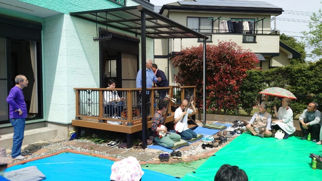 - 入り口に着いたら、玄関のドアが開いていて、涼しい風が吹き抜け中から小原節の三味線の音のお出迎え・・挨拶の後すぐに素麺定食『きのこご飯に沢庵、素麺』を戴き間もなくリハーサルを終え、近隣のお客様が見え・・六段合奏に始まり東北、北海道の民謡が始まる。師匠の日頃お世話になっております・・とのご近所さんへの気配りの様です。