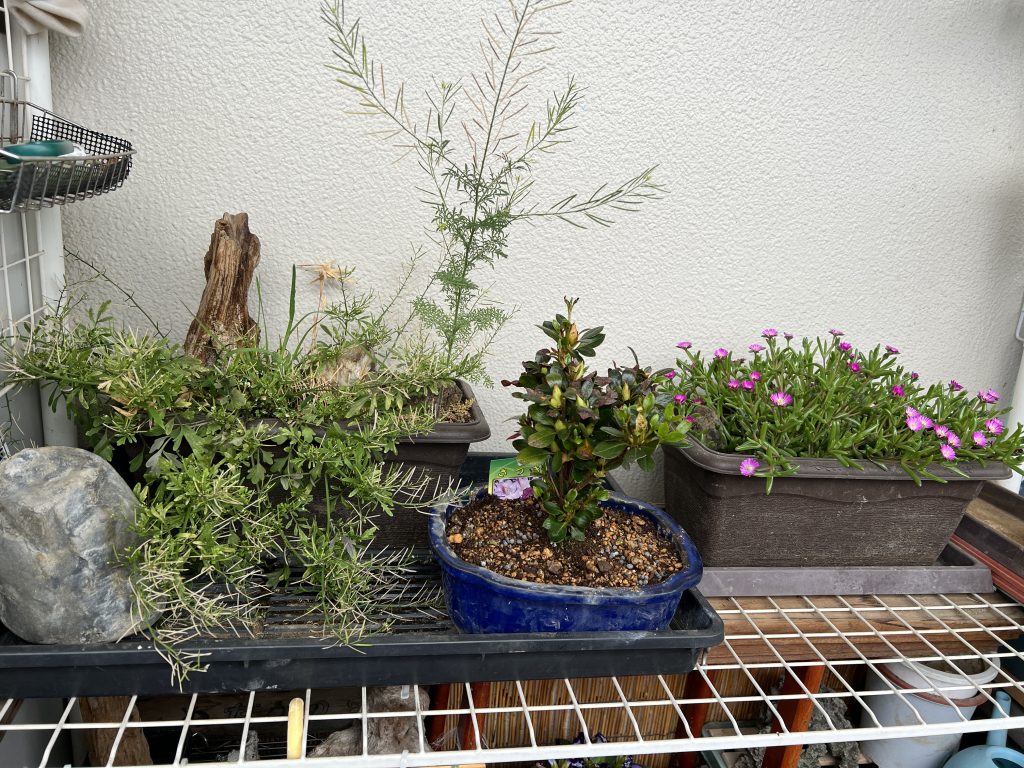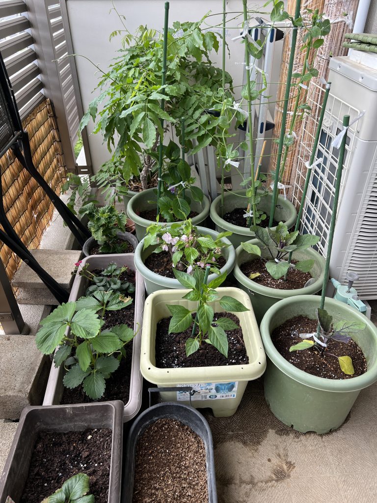 - 西日と風の強いベランダなので、何をやっても難しい様ですが、コンクリートだけの味気ない場所とあって、緑をと思い花や、実物を少し鉢植えしております。
